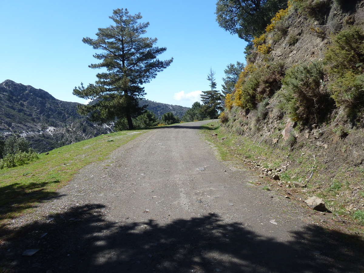 We are now on the level and I am not expecting any more inclines. At about 16 km from home we pass the fork in the track up to the right that I have taken on two occasions when I have ridden over the mountain to reach the village of Jatar in Granada province, on both occasions with a group of riders from Eva’s ‘Caballos del Mosquin’ stable. This is a three day ride with two nights spent at a hostel in Jatar. On the first, long, day we reach Jatar, the second day we took a ride to a beautiful pine fringed lake, where we could let the horses roam free whilst we picnicked, and the third day we returned to the stable. On both occasions David drove a backup vehicle with supplies for the horses and riders.