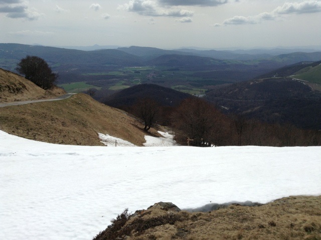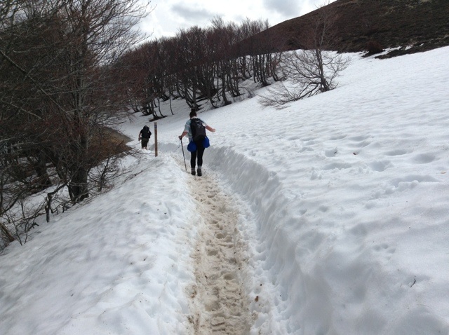After crossing the border into Spain and Navarra We finally reached the highest point at 1,429 metres at 3:45pm and from here it was all downhill, some of it in snow, some in mud, both of which were very slippery. I almost went down in the mud, first of all skidding and then over-compensating and almost falling backwards. I did however end up on the ground whilst walking through a forest of beech trees, but not much harm was done, except to my pride.