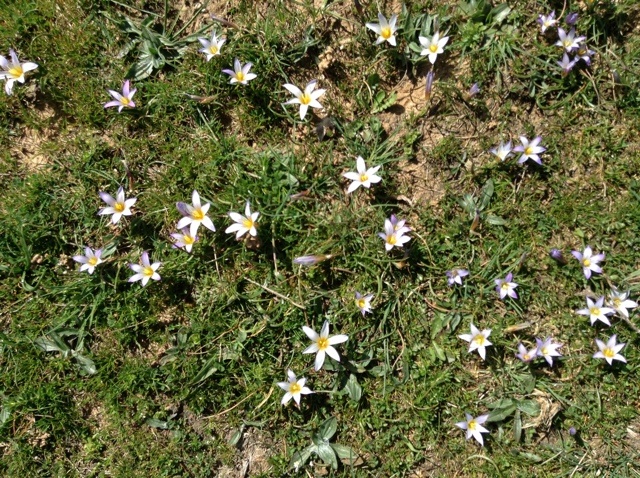 There are masses of pretty blue flowers, which I think may be gentians, growing in swathes across the grass.