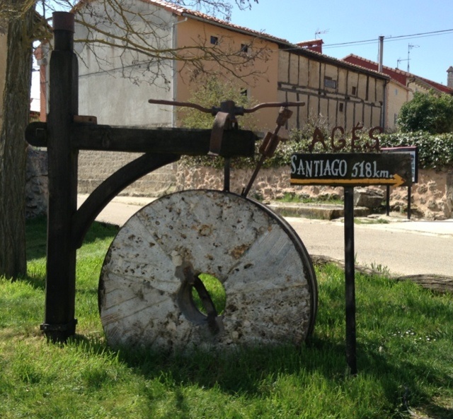Finally we can see a couple of villages in the distance. The first is Agés, tiny and very pretty. There is a quaint sign, saying 518 km to Santiago. We have learned during our travels to completely dismiss such distance markers because they seem to pull the numbers out of a hat, you can walk for ten kilometres from the last sign and find one that says 15 km more than the previous one.