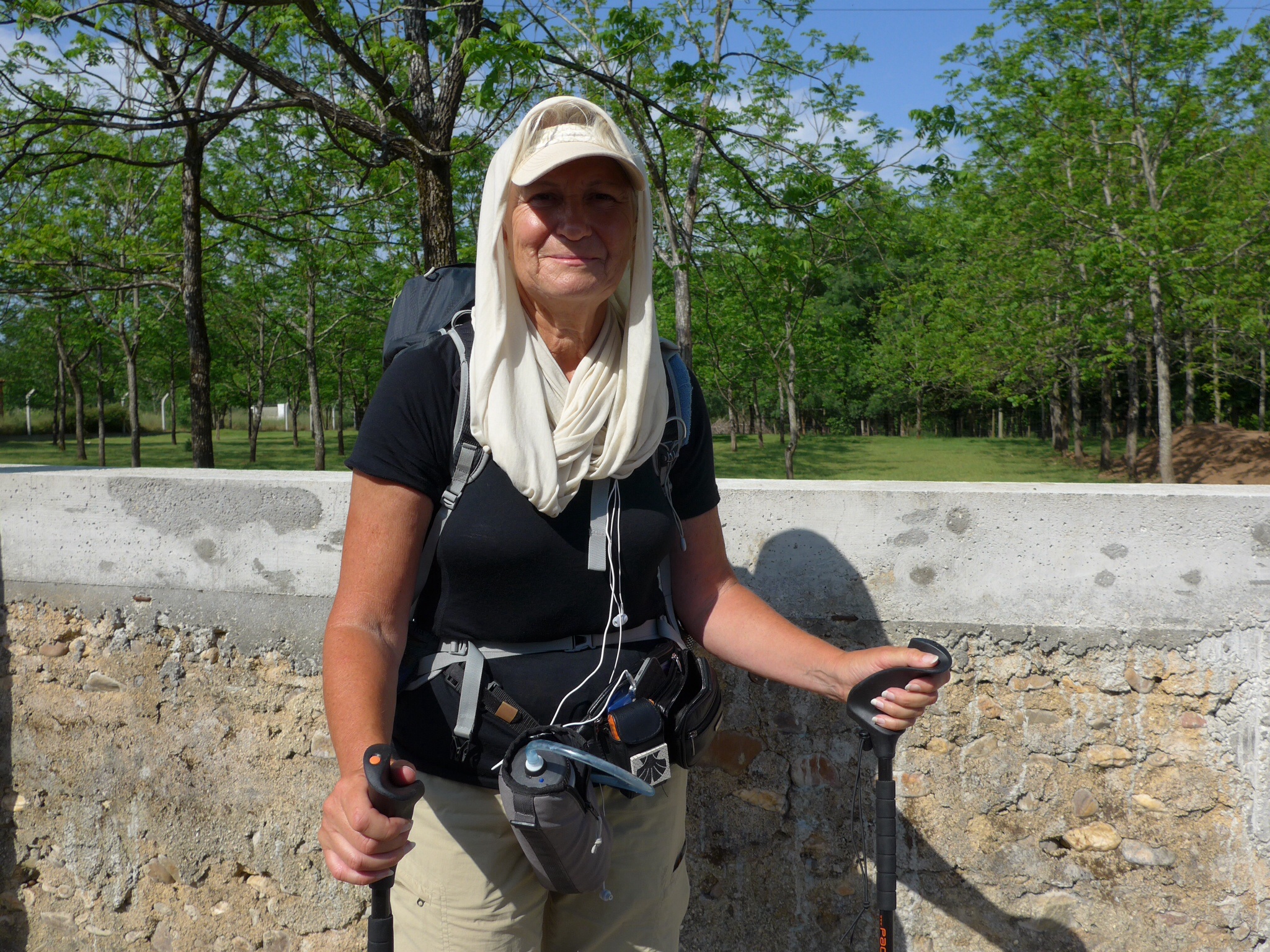 I had a willing assistant because Ella was visiting at the time and between us we fashioned the ‘super-duper Maggie shoulder cape’. I was tempted to trial it at home when it poured with rain a week or so before I left for my camino, but nobody actually chooses to walk in the rain, and in the end I chose to trust to luck rather than take part in soggy research, so it wasn’t until I left Porto that I discovered I was on to a winner – my SDMSC functioned perfectly, and was put to good use many times during the last part of my camino Portuguese! (And I didn’t look quite so daft as the ‘full poncho pilgrims’ – unless you tell me differently, of course!)