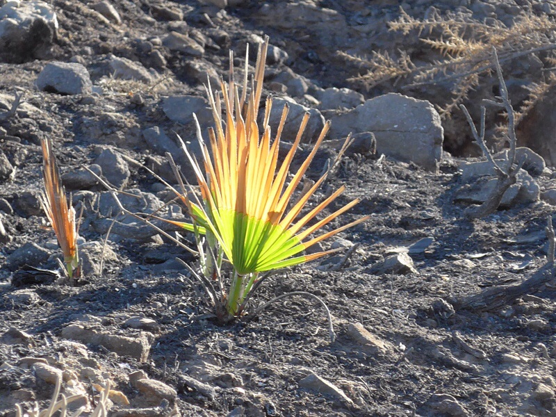 What I found most wonderful was that Mother Nature already seems to be fighting back, only small signs amongst the charred mountainsides, but (to use a financial phrase for a more literal meaning) there were signs of ‘green shoots of recovery’. Grass was beginning to show through the charcoal of the scorched land, and a single leaf of a Washington type palm was poking through the ground, the top half damaged by fire, but the lower part obviously under the ground three weeks ago was showing its bright green colour like a beacon of hope.