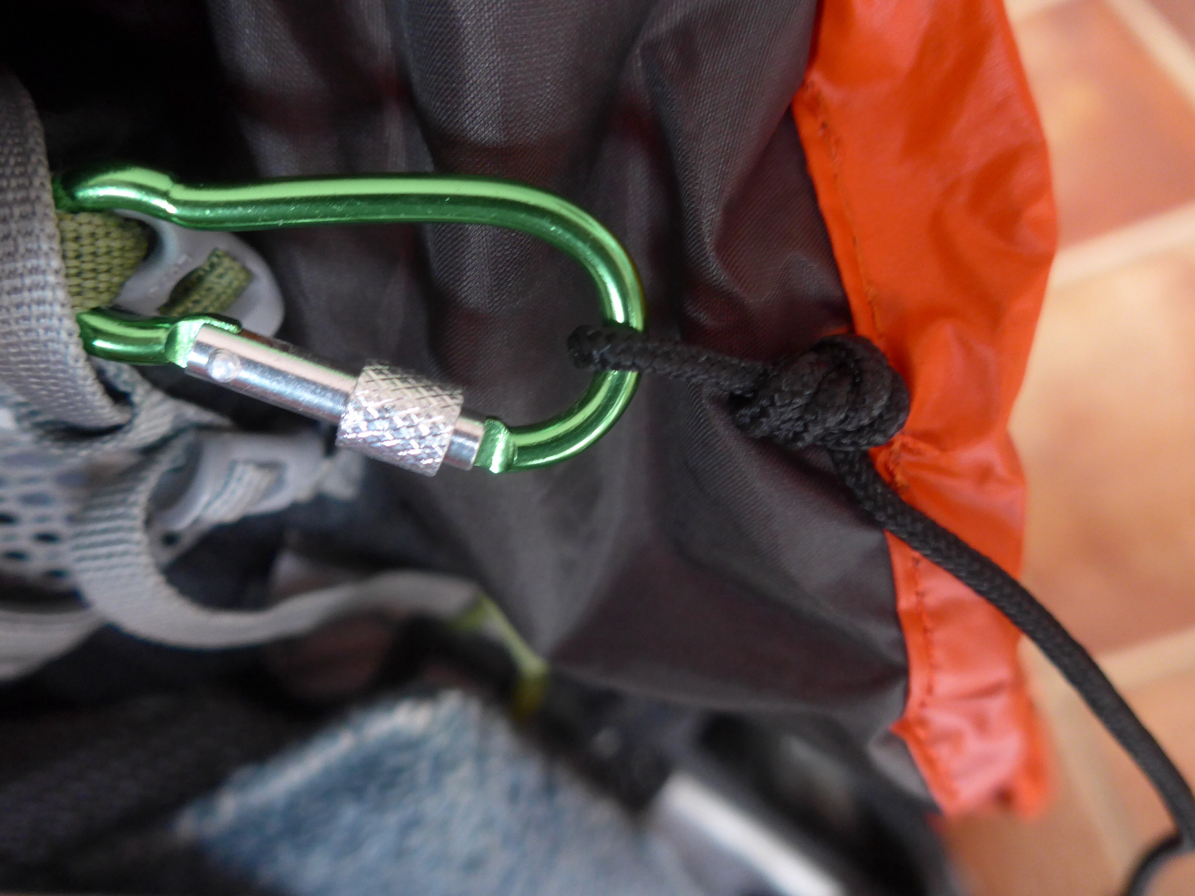 Next, I snipped a few stitches (but NOT through the fabric) of the drawstring hem at the point where the carabiners were fixed. This allowed me to pull the cord through the snipped stitches and tie a loop in the cord that would fix to the carabiners.