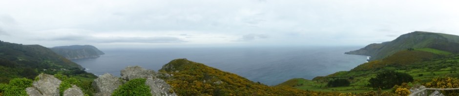 I stopped at an appropriately odd bar for a beer and slice of tortilla before visiting the church where there is a most strange assortment of items left near the alter. I then climbed back out of the valley, also on a track closely resembling the one on the way down but without the water-logged meadow. What seemed like a verticle climb, but was in fact 200 metres height over one kilometre. At the top there were more stunning views of the coastline and then a long, long slog along the road for the ten kilometres into Cedeira.