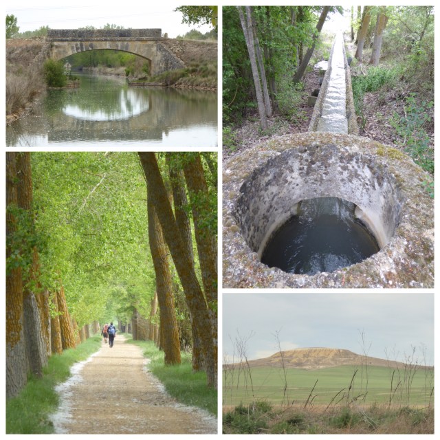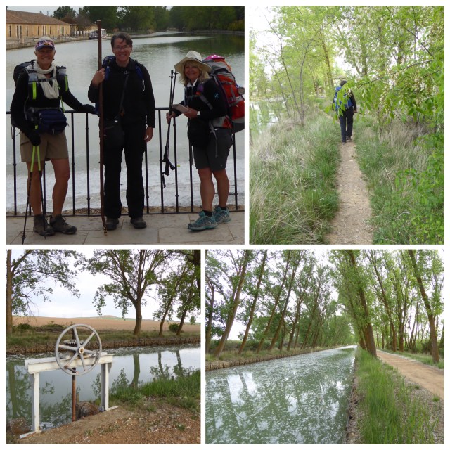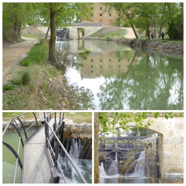 We made a fairly leisurely exit this morning as the albergue we were heading for doesn’t open until 15:00. We girls stopped for breakfast and then set off through the absolutely beautiful town of Medina de Rioseco towards the canal. What a treat we had in store. Almost 10 km walking along the tow path. The trees planted all along both banks leaned towards each other giving the effect of a guard of honour. The paths and the water were covered in fluffy seeds from the trees and formed a snowy carpet for us to walk on. Every now and then there was a sluice gate that fed the irrigation channels that watered the crops on either side of the canal. The birds were singing their hearts out and I made very slow progress stopping every few minutes to take photos. It was absolutely delightful.