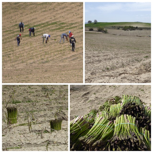 The fields surrounding the track on on the next section look very drab. From a distance all that can be seen is beige coloured soil. But we can see teams of workers bending low to harvest asparagus – it must be back-breaking work. They grow at different stages so whilst some shoots are plump and tall, others are still just peeping through the ground. The pickers have a U-shaped basket, one end open the other end closed. The spear end of the asparagus is placed into the basket towards the closed end, then when it is full the picker cuts all the stalks to the same length, binds then with an elastic band and leaves them standing upright in the field. Then someone collects all the bundles together in piles and then presumably they are taken to the distributor. All this effort makes one of my favourite foods seem very good value for money.