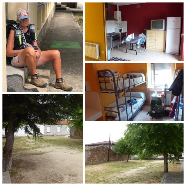 The small town of Aldea del Obispo (translates as Bishop’s village – the second pueblo with this name we have stayed the night, the other being on the Variante por Trujillo) has a municipal albergue. We have been trying to contact them by phone for a couple of days as Aurelio had heard that the albergue had closed. We received no answer from a variety of numbers that we found, so held no great hope of being able to stay here tonight. But the helpful villagers directed us to the albergue building next to the church and a young man was sent to find the hospitalera who arrived quite quickly. There are three rooms, one with one bunk bed, and two with two bunks, plus a few extra mattresses. There are four showers, two loos and each dorm has a basin. Add to that a fully functioning kitchen and dining table, a rather scruffy back yard and a grassed area to the front and we are all very impressed with the well thought out facility. 15€ with towel but no bedding, 20€ if you need bedding. There is a good shop in the village so you can buy food to cook, and of course there is a bar where you can order a meal. Website and telephone number for the hospitalera Rosi 0034 628 549 912.