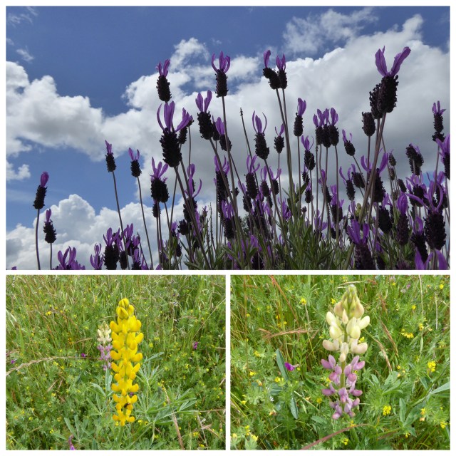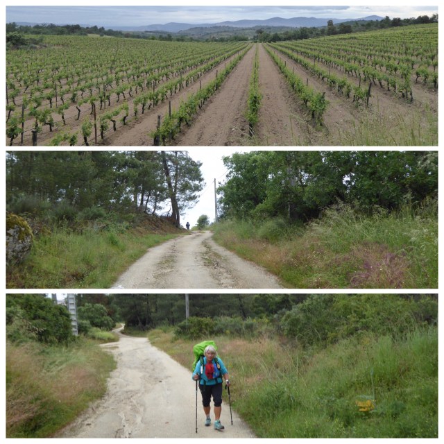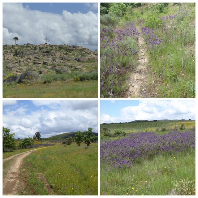 We are soon walking between boulder strewn mooreland and vineyards with occasional stands of pinetrees – still lots of lavender and broom.