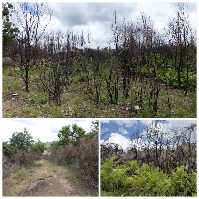 As we start to climb we can see there has been a recent fire – last year I think. What would have been a walk through a corridor of broom was now a corridor of dead black sticks.