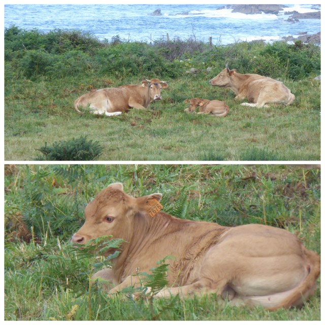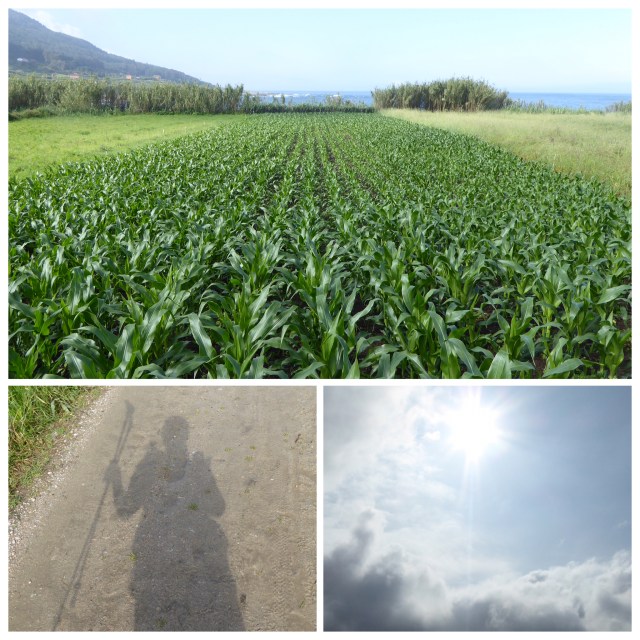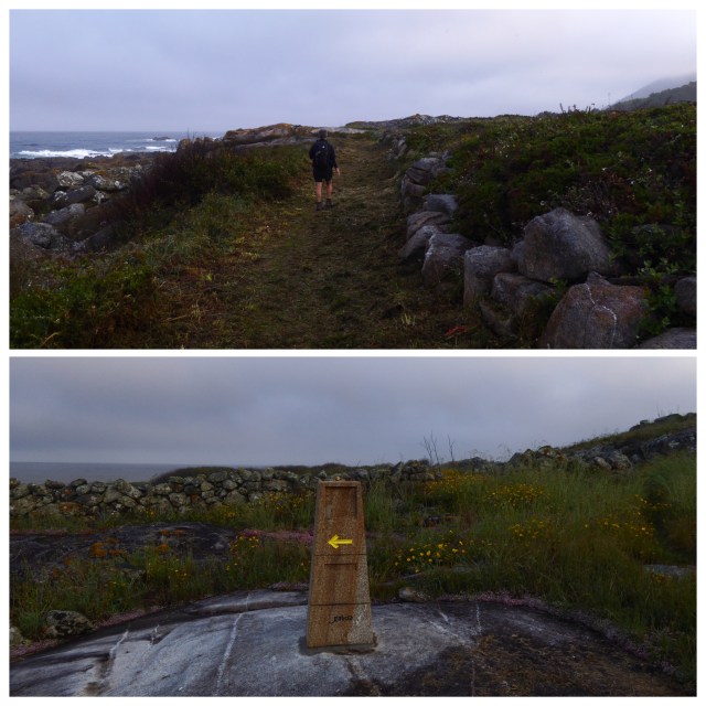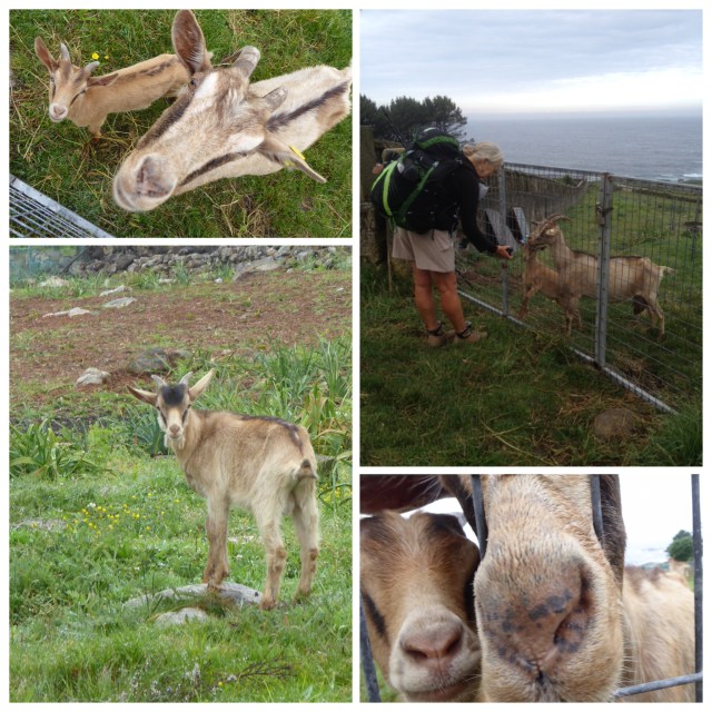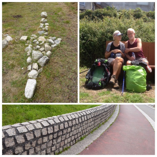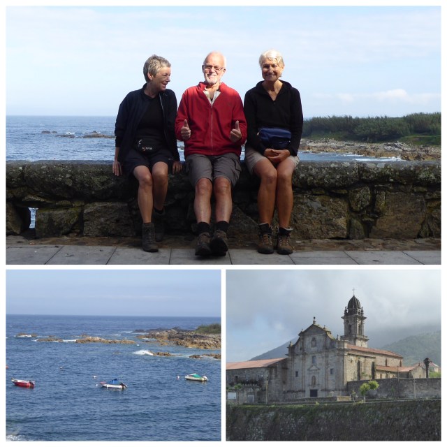 Then we were up, up and away from the road, climbing over rocks and boulders looking down on the sea and lighthouse. It was fabulous to be on uneven land for a while, even if it was a bit of an effort, and then down the other side, through countryside and farmland, until we approached our intended stage end at Baiona. But in following the arrows we realised we had bypassed the town and ended up a couple of km beyond.