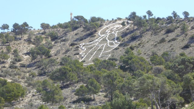 At around 18 km we are at last on an interesting track through scrubland and occasional stands of pine trees. High above us, atop a ridge, I see what is probably a chapel clinging onto the rock face. And then I make out a huge statue towering above us in the form of Rio de Janeiro’s Christ the Redeemer, but is apparently San Pascual. We come to an option to climb a bit higher to get up close and personal with the saint, but don’t find it too difficult to turn in the opposite direction and head instead downhill towards the first town on this stage – Orito at 24 km. On looking up to the statue from this angle I can see another giant form of San Pascual etched into the hillside.