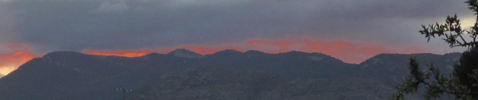 Once off-road we are walking through very scrubby land on a soft dirt track. We look back towards Sax and the outline of the castle is very dramatic, as is the red-tinged cloud rising above the mountain ranges.
