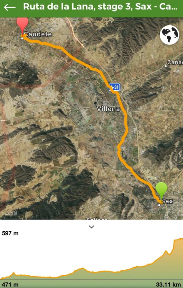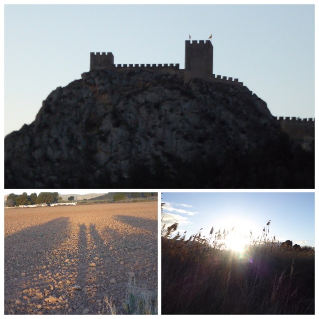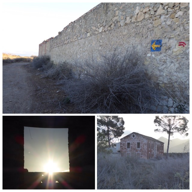 At 10 km we are back on the road for the approach to the town of Villena. At 14 km we stop for hot drink and toast. There is a church of Santiago but it is closed at 10:00. This is another sprawling town that runs for several kms. On exiting there is a major roundabout to be negotiated – a bit scary! But we discover that if we had approached it from the left-hand side there are zebra crossings to ease the way. Also I could see from my map.me app that there is a diversion to the left that takes us on track, rather than immediately next to a busy main road.