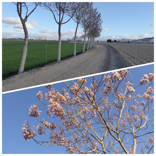 The track is very flat and very uninteresting. No wild flowers to distract me. No animals to commune with. And if it was hot – absolutely no shade. We slog on in a very beige landscape. But eventually the scrubland becomes ploughed, ready for planting and then I finally see a green field. It’s funny how the simple things in life can cheer you up no end – the green fields of cereal crops in the lovely sunshine totally lift my spirits, especially as we are now walking between fields along a track lined with beautiful flowering trees.