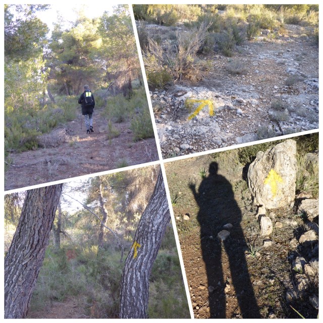 For some reason my Wikiloc tracking app stopped working as we left the village and I didn’t notice until I reached a road some time later. When restarted, it just drew a straight line and told me I had walked 5 km. A short while later we were on an enchanting track through a pine wood on a carpet of needles. The path is really narrow, barely discernible, weaving through the trees, but there are lots of arrows and dots to show us the way.
