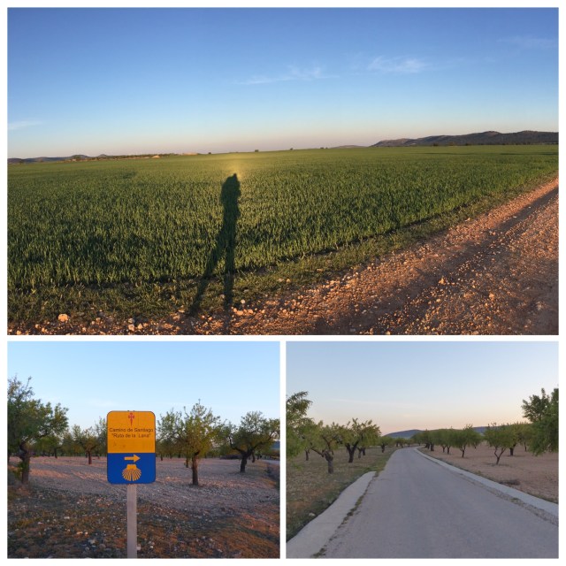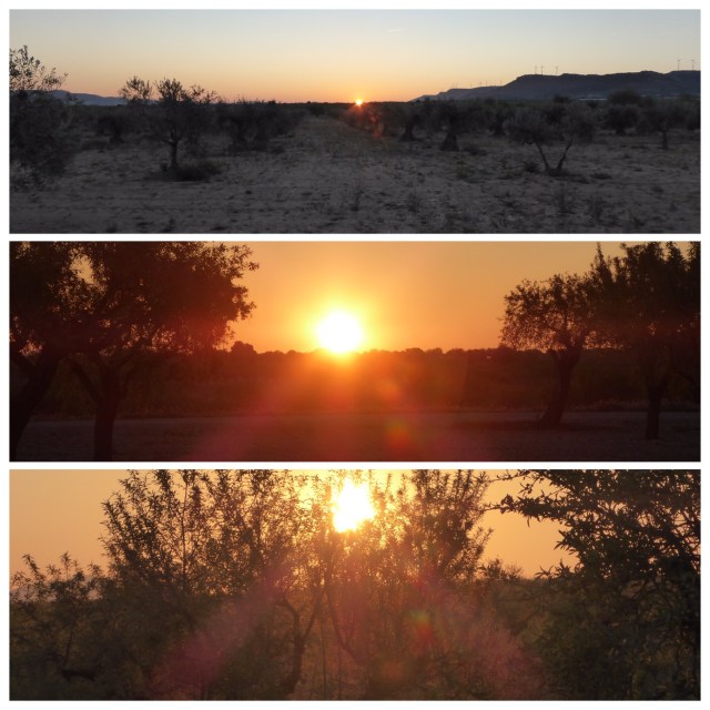 We left before 07:00 in the knowledge that we could get some breakfast in the bar on the way out of town. By the time we left the bar the sun was about to rise and we were very soon walking along gravel track through olive and almond groves. There are many, many almonds growing in this area.