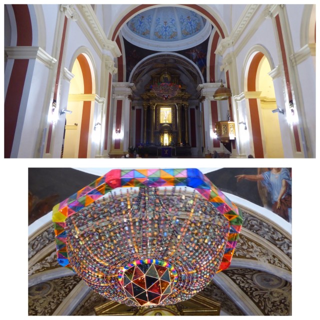 We visited the church to see if we could obtain a sello for our credenciales. It was approaching time for mass and quite a crowd had assembled. We found a very helpful man (a curate?) who happily stamped our passports and gave us interesting information about the church, including pointing out the huge chandelier/disco ball that was hanging from the vault above the alter, telling us it was a Christmas decoration made of coffee machine capsules. How clever, apparently made by one man from thousands of those pesky pods.