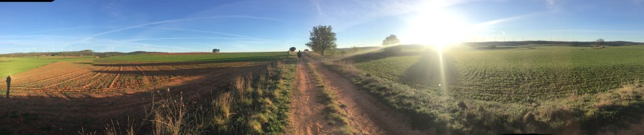 We left via the emergency exit at around 07:00 prepared for a very long day. It was quite cold and as we passed through the church square we were very pleased to see one of the bars open. Hot drinks were supplied, but no toast was available.  We were walking on tacks immediately on leaving the town, between huge fields of newly planted peas with wind turbines flanking us on both sides.