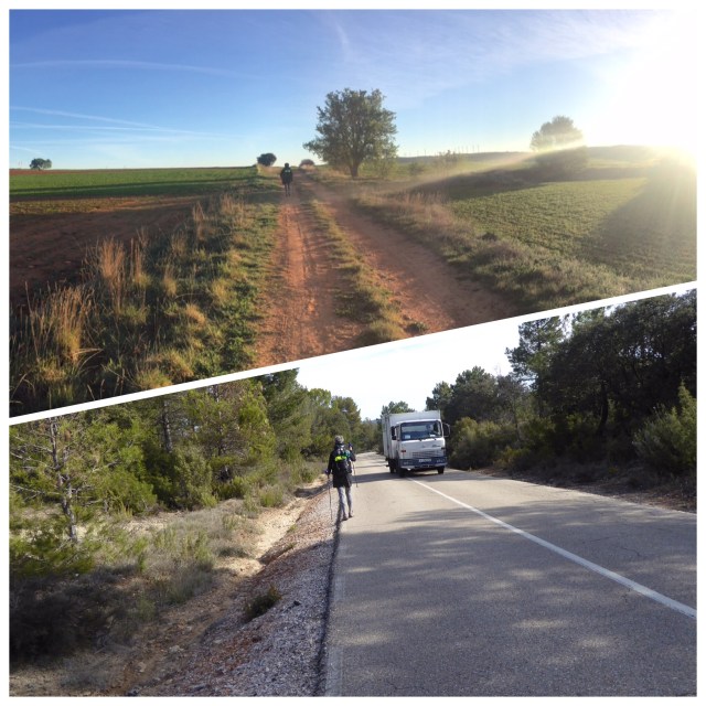 At 7 km there starts a long slog on the road.  A quiet road, but 9 km on asphalt takes its toll.  The road passed through a pine forrest and Nina was intrigued to see processionary caterpillars for the first time.  The pesky things were trailing all over the place and we needed to watch our step so as not to squish them.