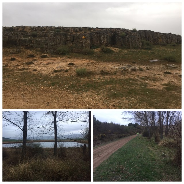 It didn’t take long for the dirt track to turn to thick, sticky clay – the type you could build a house with. Unfortunately our job was to walk, not to build. The only thing that built, was the depth of clay clinging to our boots. One might suppose that there is a finite amount of clay that can cling onto a boot before naturally dropping off. But nope. The amount is infinite. I reckon I was at least three inches taller and four kilos heavier. Every step collected more of the sticky stuff, making the walk very hard-going – really tiring. And on a dry day this track would have been an absolute delight – interesting scenery including lagoons, rock formations, undulating crop fields. All that we have wanted from this camino came today.