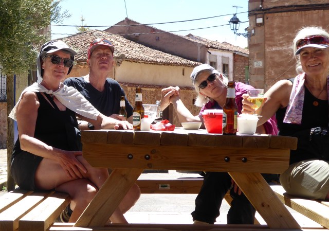 Then we were on the road for way too long, probably 2 km, before reaching the next village, Miedes de Atienza at 18.25 km, where there is another bar below the ayuntamiento with some handy picnic tables close by.  I eat quinoa, avocado and tomatoes from my supplies.  Our Swiss friends Marianne and Ruedi join us.  They are planning to walk only another two days.