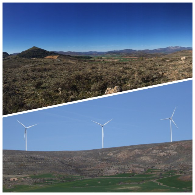After the village we are once again walking through the flatlands with a bank of wind turbines – their blades barely turning.  We can see snow on the tops of distant mountains.