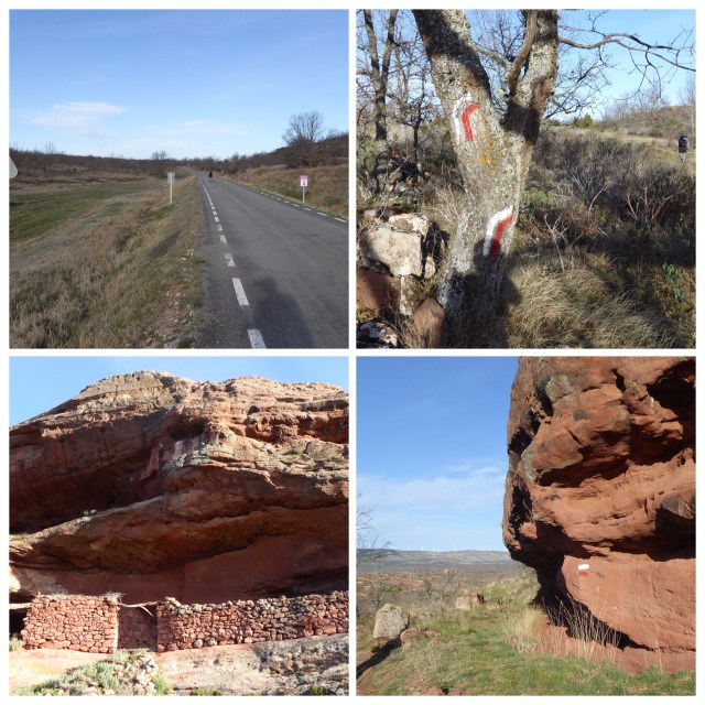 A lot of the cliffs are deep red and there are many ruins that were built into the rock face. It’s an absolutely fabulous walk over all types of ground. But the red and white stripes indicating the way are not always easy to see and we do get a bit lost, but can see from maps.me that we are heading in the right direction. Eventually we cross a small crop field to reach the road and immediately see the stripes. We should have got onto the road some time sooner, but no harm done.