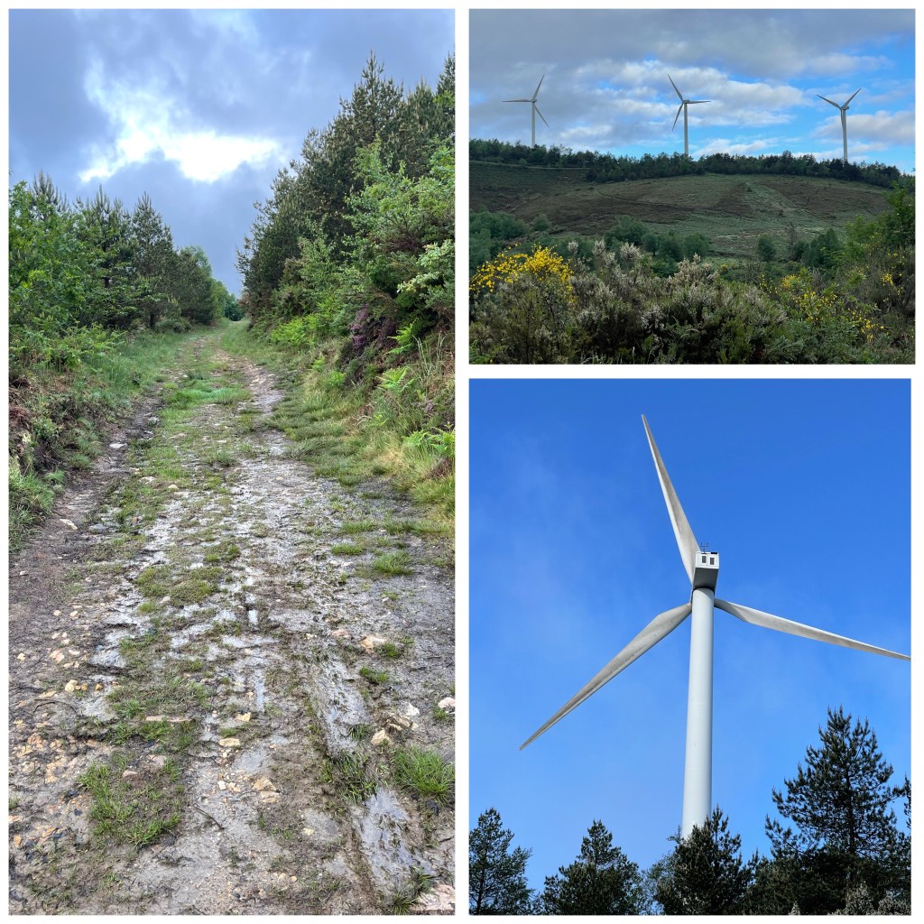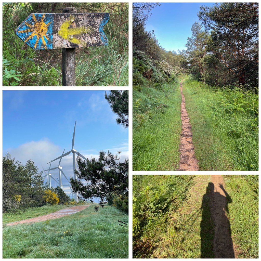 The day starts fresh but dry. Very soon after leaving the albergue I am directed onto a track, which is lovely and soft due to the rain. After quite some time there is a longish stretch on the main road and then back onto tracks again rising ever higher towards the wind turbines which are whizzing around with some speed.