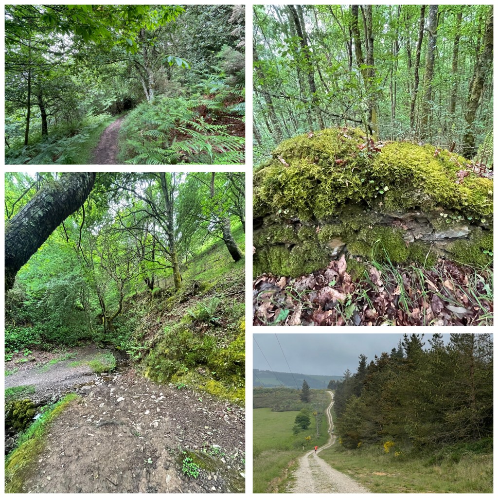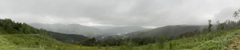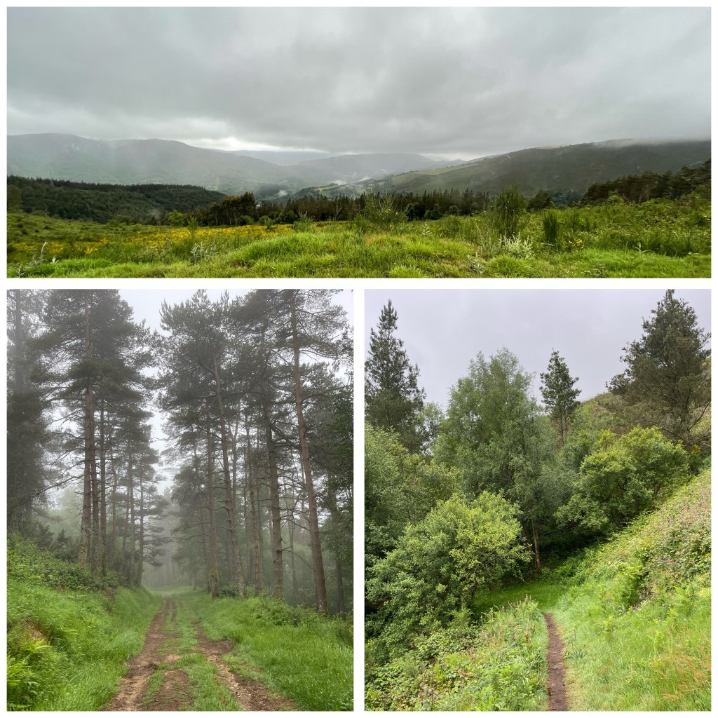 The paths have been lovely to walk on – the recent rain has made them soft without, for the most part, making them muddy. The views over the valleys are marvellous revealing wide vistas of pine trees and green fields all topped off with threatening cloud. The sun hasn’t put in an appearance so far today and it is currently noon.