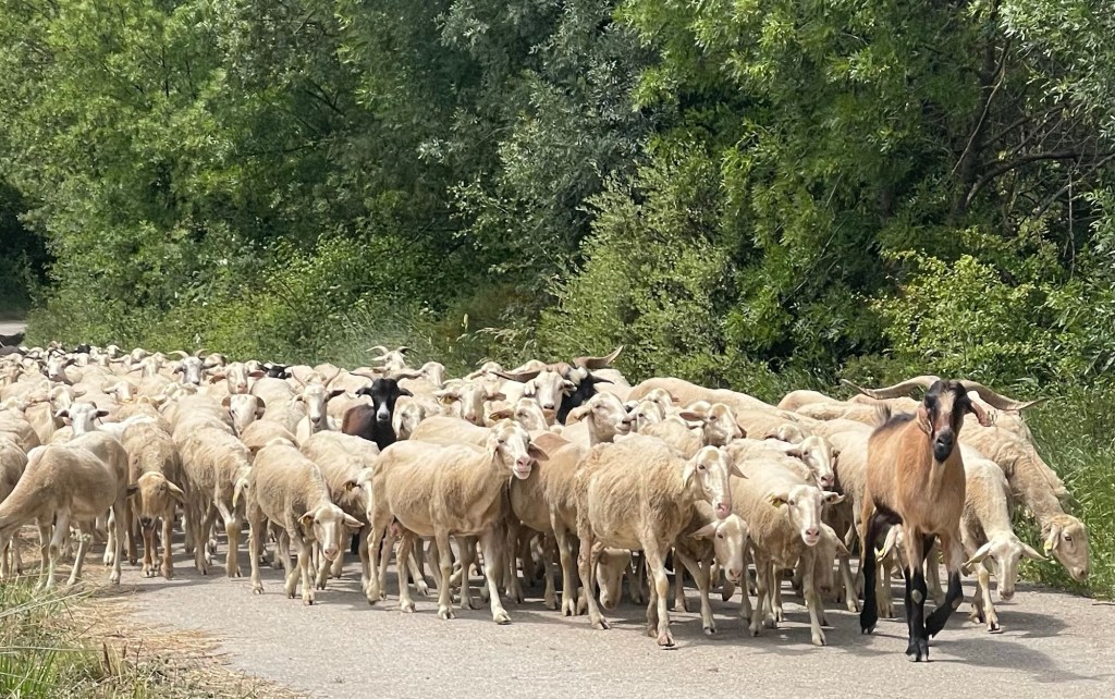 We meet up with a large group of sheep – rather smelly at such close quarters but a treat to see them and hear their bells ringing.