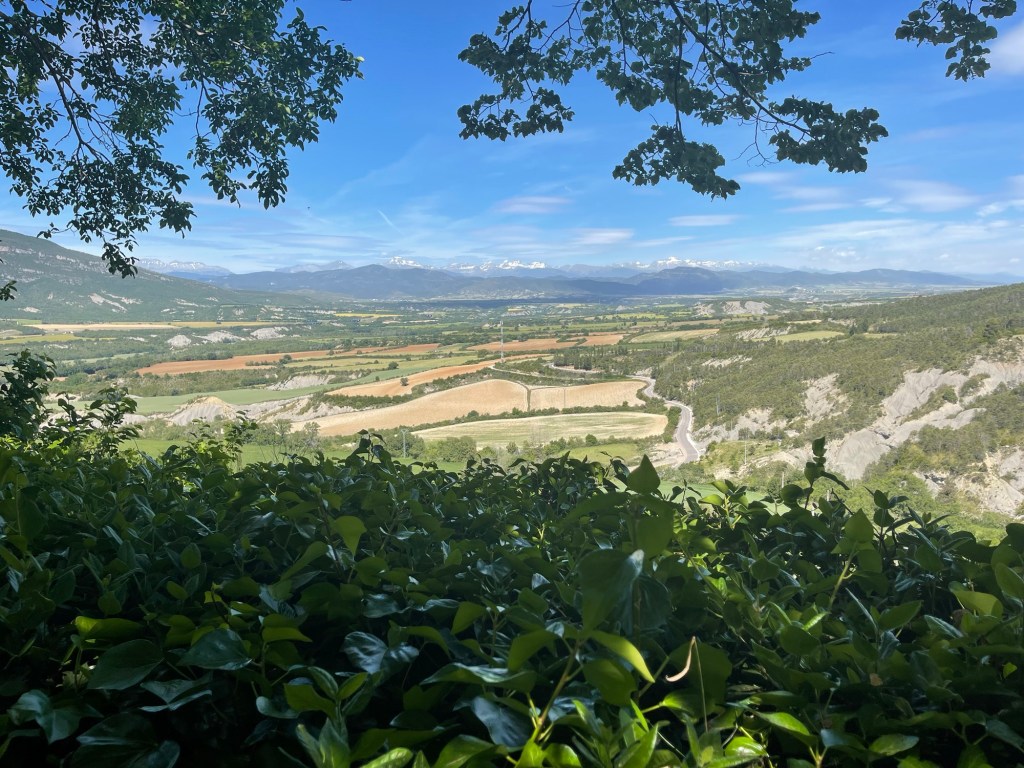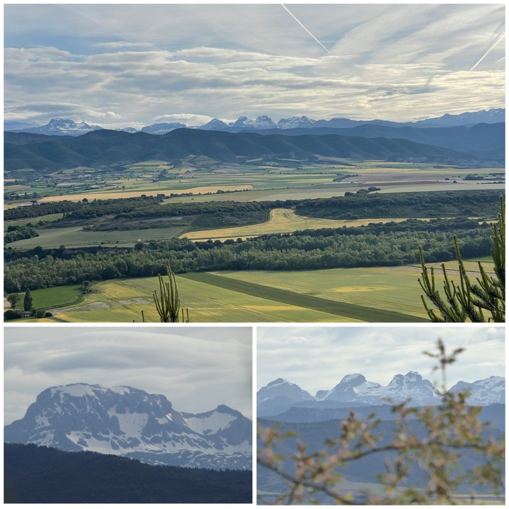 Now that we have climbed on this narrow path, I can see down below the flat plains of crop fields before the Pyrenees rise up in the distance. There are lots of rugged peaks and they are all crowned in snow.