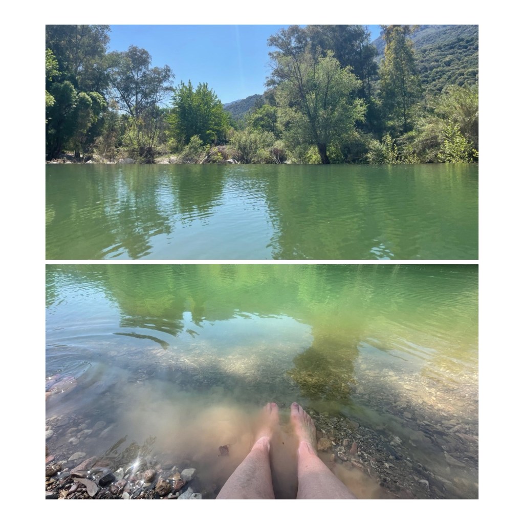 Getting closer to the stage end I reach a lovely shady area by the river and wait for Nina to catch up. When she arrives we decide to sit on the bank and soak out feet for a while. It was very cold and just what we needed to help us up the last big hill to our destination.