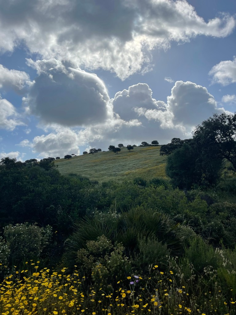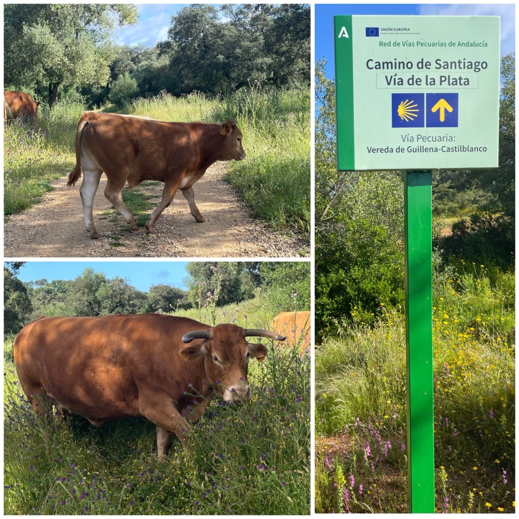 Soon enough the path becomes a via pecuaria with the landscape of a dehesa – a variety of trees dotted about and beautiful wild flowers in all directions.The purgatory of the last few kilometres is wiped clear with these new surroundings