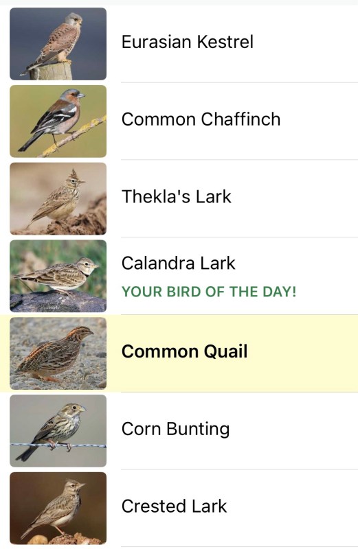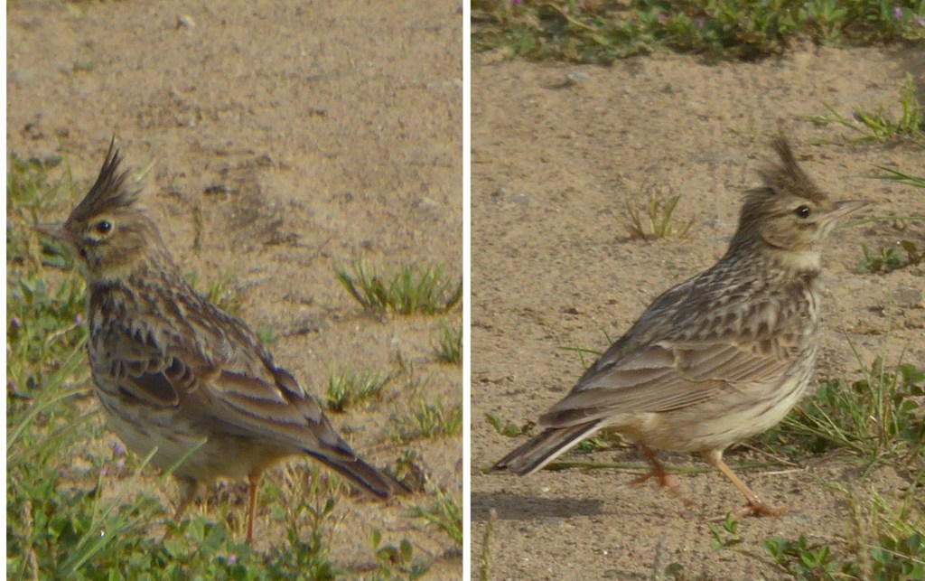 Someone asked me if I see any of the birds that I record and I probably see lots of them but I don’t necessarily recognise them. But just as I sit here a bird alights on a bush next to me and starts singing. Quickly I start the app and discover it’s a corn bunting, although it looks rather like a sparrow to me. I’ve also had several occasions when a lark has landed on the path ahead of me and I hope today I managed to take a decent photo of it – which lark it is I have no idea – probably crested as it has a top knot – although comparing it to the image at the end it may well be the Thekla’s lark