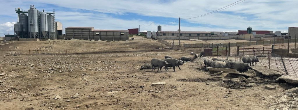 The last stretch is a wide, arrow straight track between crop fields with a lot more vile pig units with the most appalling sickening smell. When I’ve walked in Extremadora previously the pigs I’ve seen have all been happy chappies roaming wild in the acorn groves of the dehesas. I suppose this area is where the cheap jamon comes from.
