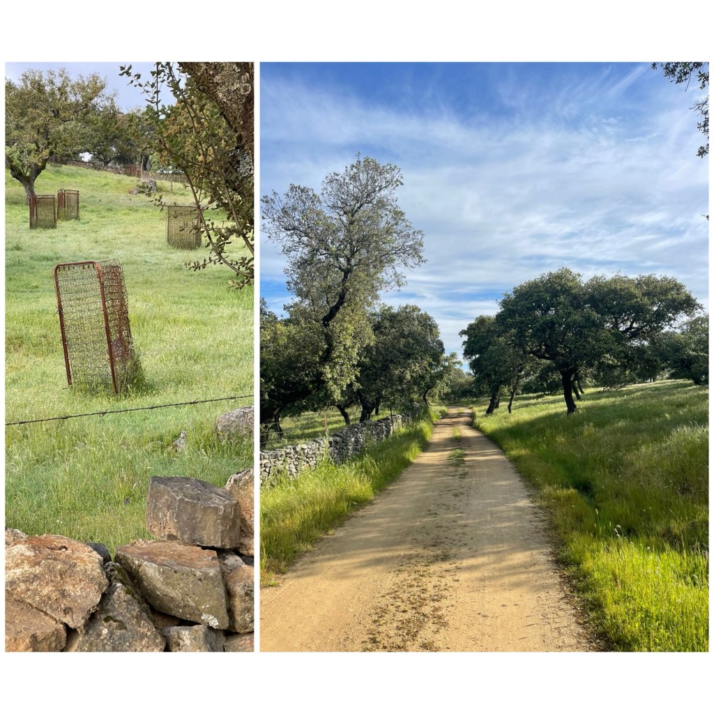 The exit from town is short and I’m soon on a quiet road alongside an olive grove. There are oak trees covering the hills in the distance. I’m very soon onto a dirt track alongside a stream. The stone wall enclosures now replace most of the barbed wire – I do love a stone wall.