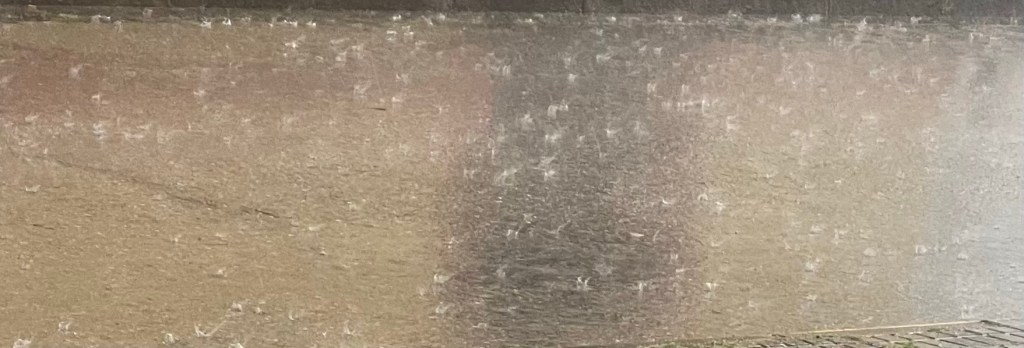 But there’s yet another aqueduct 18 minutes’ walk away – so we go for the full house. Unfortunately we’ve been walking for about ten minutes when a few drops of rain fall from the sky, and then a few more and then there’s a huge clap of thunder, a sudden gale of wind, and the heavens open. Luckily we find shelter in the overhang of a building and wait it out until it all calms down about 15 minutes later. So we only get to see a bit of the second aqueduct from a distance because we decide to hot-foot it back to our apartment.