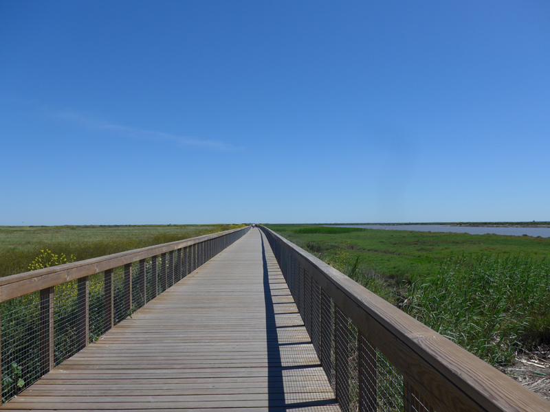 Raised timber walkway through wild riverside scrubland at Tagus Linear Park between Sacavem and Alverca do Ribatejo
