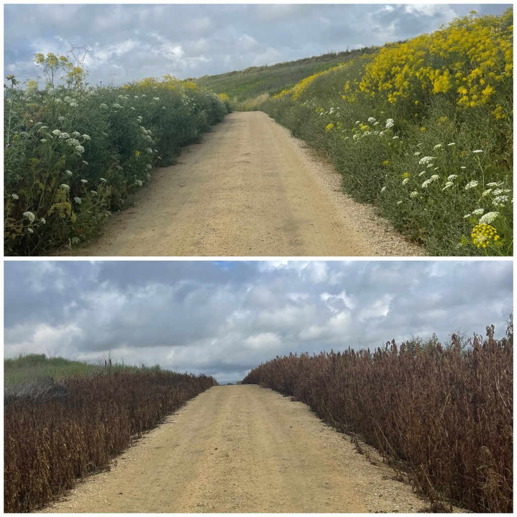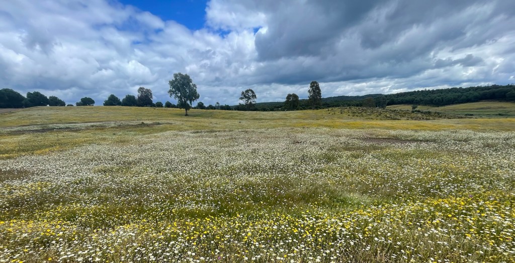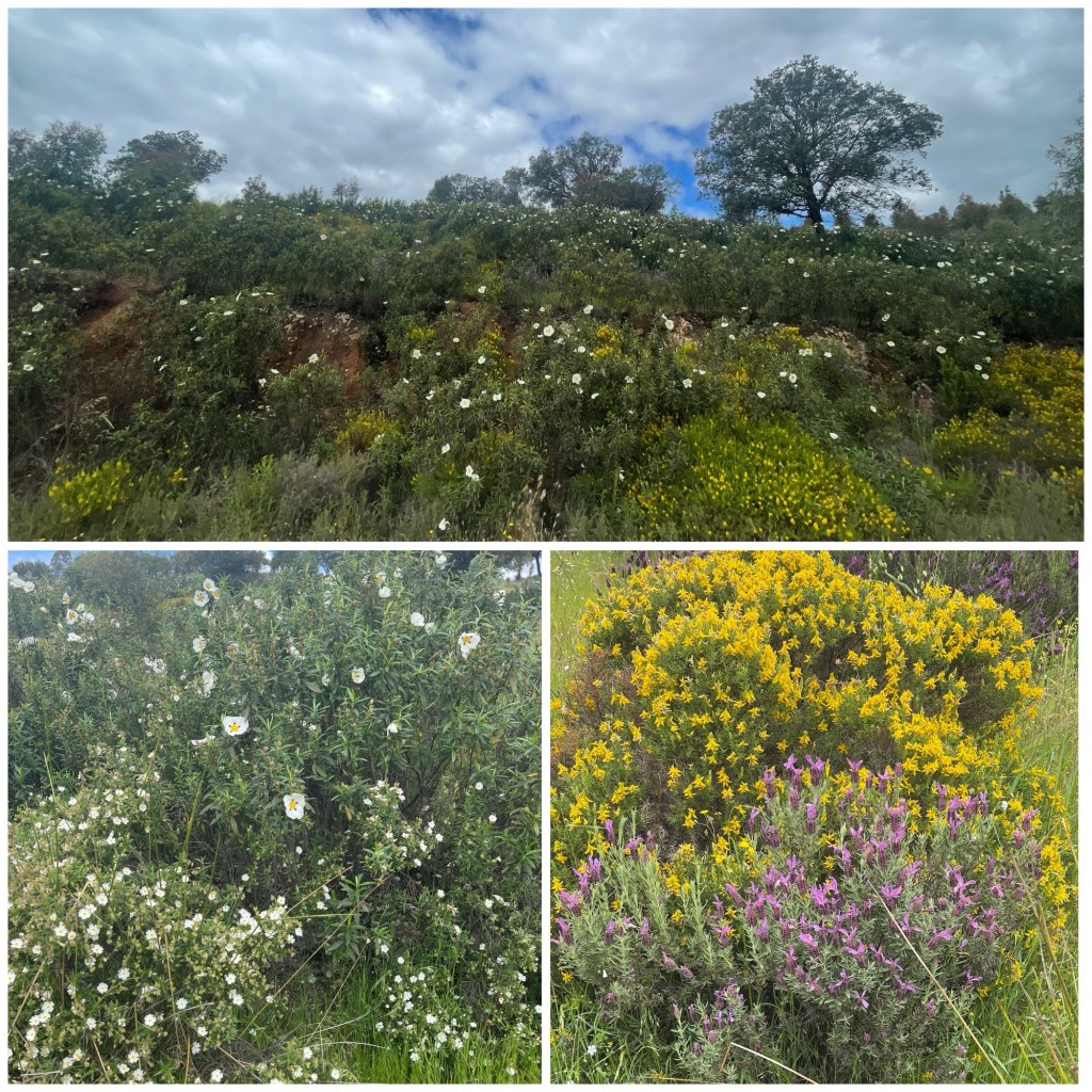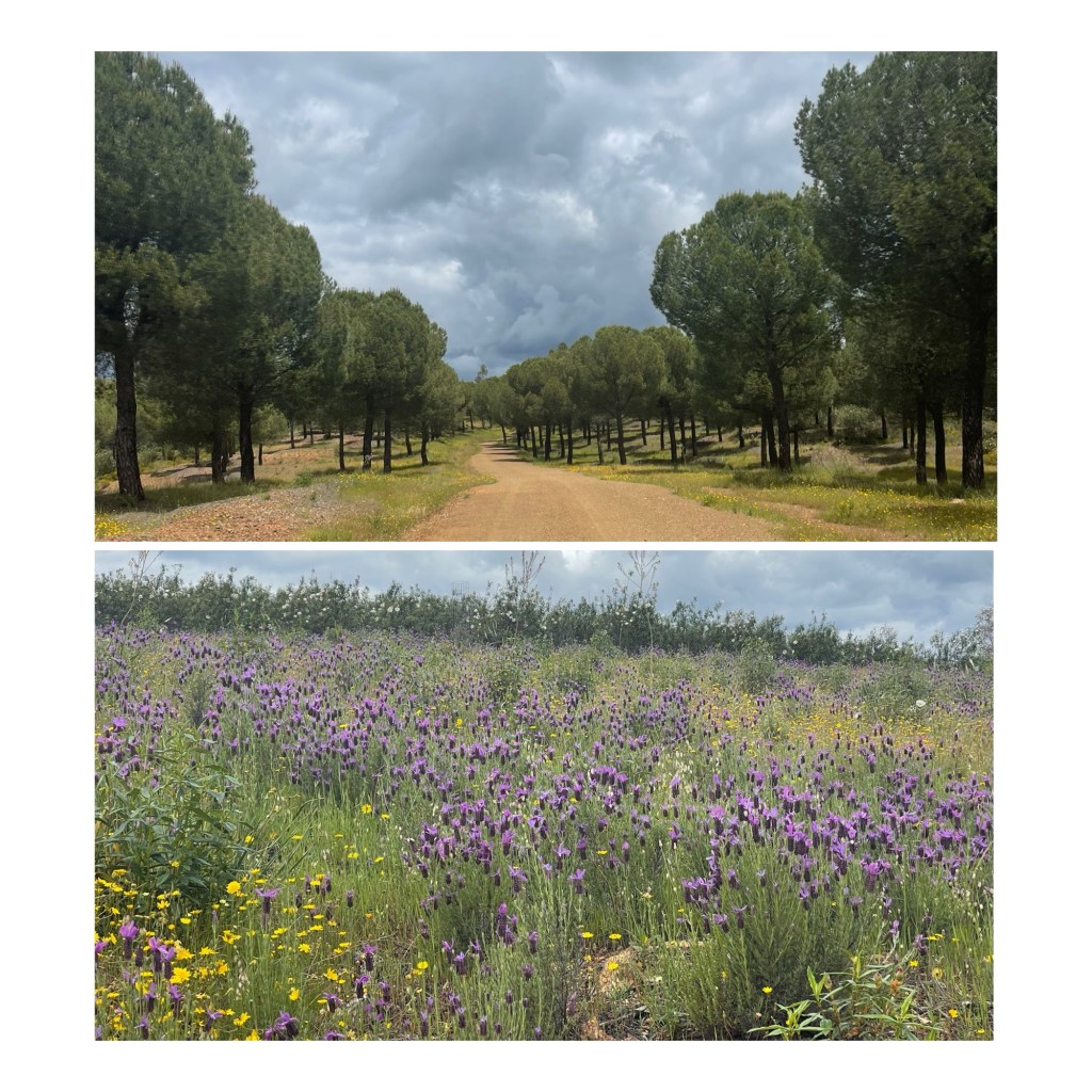 We are still in the parque natural in a totally different landscape – rolling hills with yellow and white daisies and lavender. And a bit later through pine trees.
