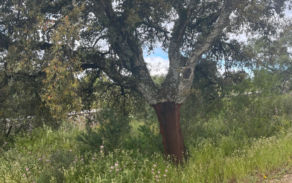 We walk through a vast area of cork oaks, some of which have been recently harvested and some are beginning to grow back their bark. There’s a massive field with trees dotted about amongst grass and flowers – nothing that seems like a crop. Google tells me that… cork oak is unique in its ability to regenerate its outer bark. After a tree reaches 25 years of age, it can be stripped of its cork once every 9 to 12 years without causing damage to the tree. A single cork oak, which lives up to 200 years, can be harvested over 16 times.