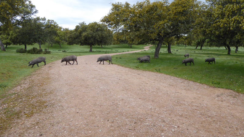 Alcaracejos to Hinojosa del Duque 23 km. Leave town on a compacted dirt track through agricultural land with herds of cows, sheep and goats, huge crop fields dotted with holm oaks. There are two villages at 2 km and 10 km. The approach to Hinojosa del Duque is not very pleasant through an industrial wasteland but the town is pleasant. Call in at Policia Local, next to Ayuntamiento to register and for key to the albergue just around the corner, four bunks, sleeping eight, a decent bathroom, no kitchen but a room with a microwave and a large table, wifi, no charge! Once again, no facilities on next stage – buy supplies!