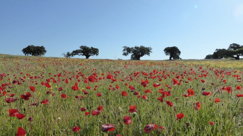 Cerro Muriano to Villaharta 21.5 km. 4 km on road past huge army base, then woodland tracks often within hearing of the busy road, but very pleasant with lots of wild flowers. Village of El Vacar at 12 km with several bars. At stage end we stay in Hostal Mirasierra which has several rooms with twin beds, a kitchen with only a microwave and one shared bathroom, large terrace, 15 euros. Bar/restaurant downstairs. Tomorrows stage is 38 km with no facilities so take supplies. The bar owner will drive pilgrims to the half way point if 38 km is a problem.