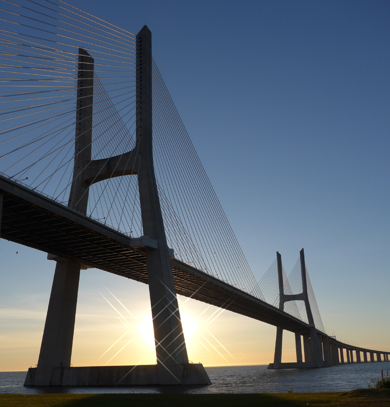 The sun rising behind the Vasco de Gama bridge spanning the River Tagus in Lisbon. Completed in 1998 in time for the Expo 98 World Fair. Europe’s longest bridge at 17.2 km